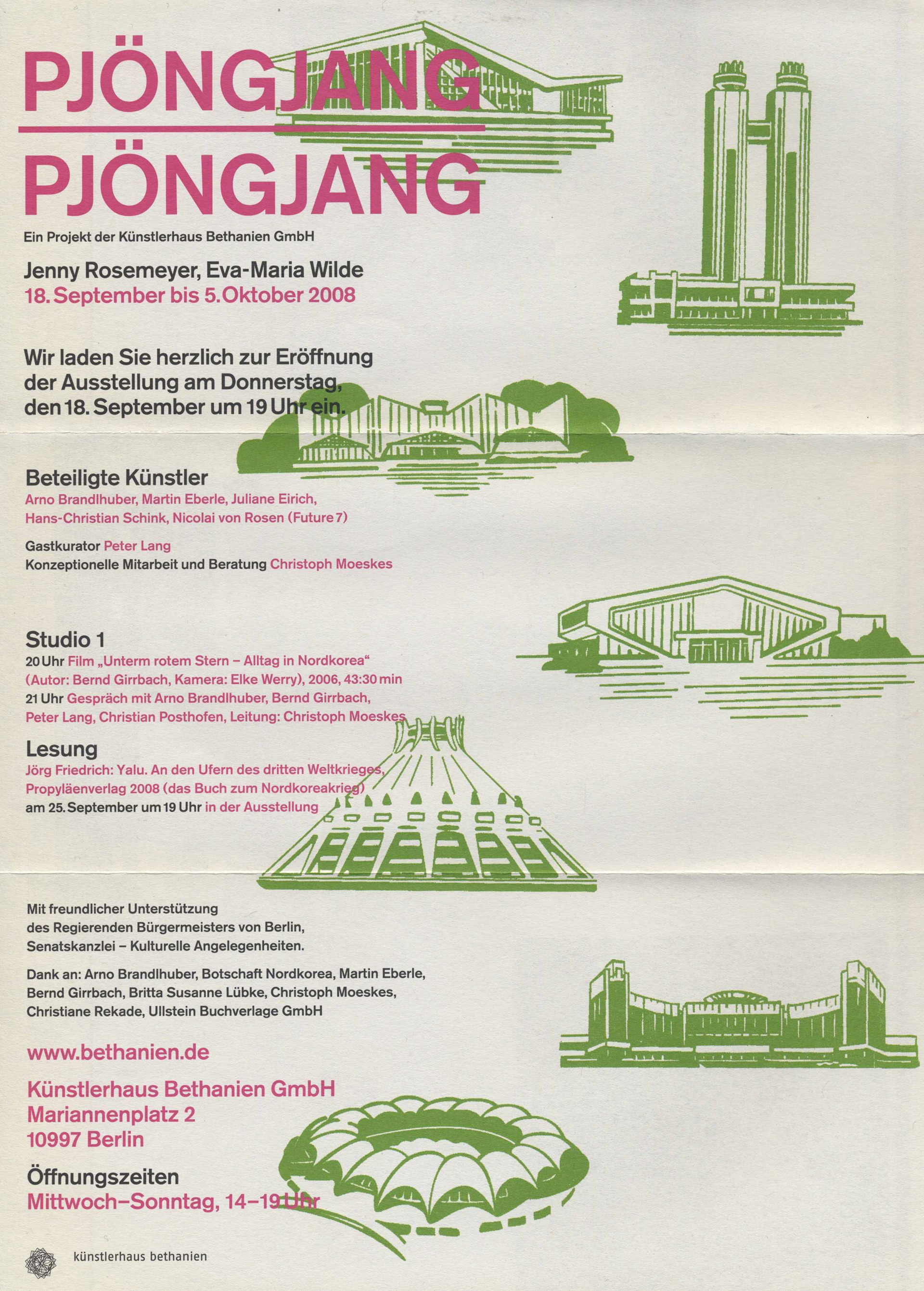 Die Ausstellung „PjöngjangPjöngjang“ von Jenny Rosemeyer und Eva-Maria Wilde reflektiert die private Reise der beiden Künstlerinnen durch Nordkorea im Jahr 2007. Dabei werden Außen- und Innenansichten aus Nordkorea präsentiert und längst festgelegte Positionen hinterfragt. Die Künstlerinnen werfen einen kritischen Blick auf die Konstruktion des Künstlers als Betrachter und seine Beziehung zur Gesellschaft sowie einen Rückblick auf die erfolgte Recherche. Die Ausstellung thematisiert die Umformung einer politischen Ästhetik in eine subjektiv künstlerische. Es werden Werke gezeigt, die den eigentlichen Gegenstand der Betrachtung, das Land Nordkorea in seiner aktuellen und geschichtlichen Wiedersprüchlichkeit, umgebrochen in eine künstlerische Ästhetik reflektieren.