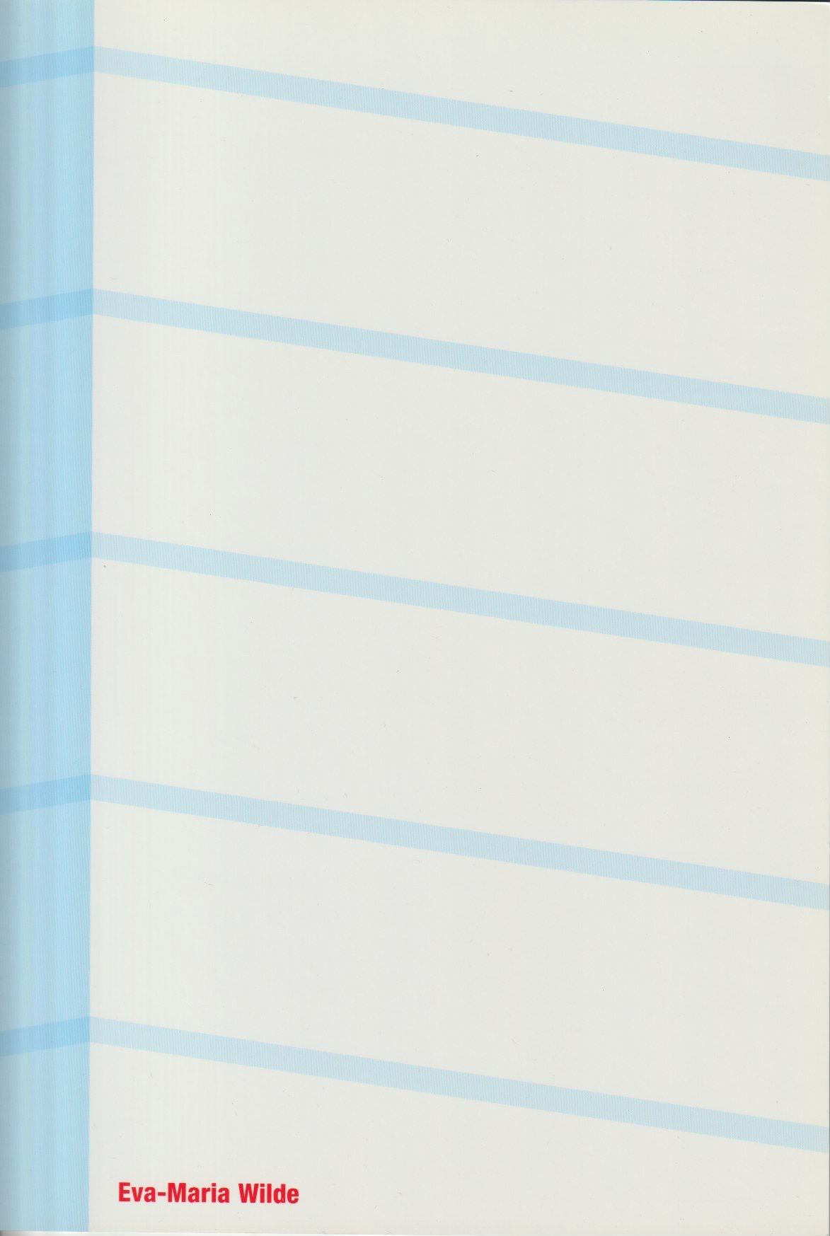 Walter Benjamin , In order to fully understand the sorrow of such glorious, bright cities, one had to have been a child in them. When Maria Wilde was born in Dresden, the Transit Agreement between the two Germanies had been in effect for one day. The XXth Summer Olympic Games opened in Munich. Angelika and Berndt Wilde moved to Berlin-Adlershof with their daughter Eva-Maria. The Fernsehturm (Television Tower) on Alexanderplatz was still a radiant innovation. Papua New Guinea gained its independence. In New York City a blackout was caused by a lightning storm. The Palast der Republik (Palace of the Republic) opened in the GDR. Sigmund Jähn became the first German astronaut. Eva-Maria Wilde went to school. Josip Broz Tito, the president of Yugoslavia, died. A strike began at the Lenin shipyard in Gdańsk. Pope John Paul II rehabilitated Galileo Galilei. The Wilde family moved from a two-room ground floor apartment to the top floor of a prefabricated, standardized glass and concrete high-rise in Berlin-Lichtenberg; to wasteland, sandhills and the smell of fresh concrete. The first trips – to the Soviet Union and annual summer vacations in Budapest – followed this move. On the Glienicke Bridge twenty-five spies from the West were traded for four agents from the East. Five hundred thousand people demonstrated at Alexanderplatz. Eva-Maria Wilde received her diploma during the last year of the German Democratic Republic. She had already applied to the Hochschule für Bildende Künste in Dresden, where she would be the youngest and one of the few women in Prof. Kerbach's class. She shared her studio with Eberhard Havekost and Thomas Scheibitz. She remained in Dresden until the start of her Master's program, although she did not settle there. She had already traversed Italy within her first academic year and she traveled to New York before the beginning of the second. Trips followed to the Amazon River area in Peru and to the Galápagos Islands of Ecuador. Before her return from Dresden to Berlin, she was in Malaysia, Singapore and Eastern China. She began the new millennium with a second trip to China and an extensive stay in Brazil, as well as trips to Belgrade and Beirut. Later, she would travel through the Ukraine and Romania by car. This was followed by a short excursion to Tangier. A trip to North Korea is imminent.